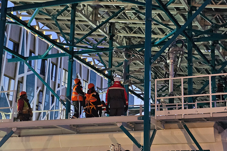 Основу полигона составляют вертикальные стальные рамы, соединенные переходными мостиками и площадками различного уровня сложности. Конструкция включает имитацию промышленных объектов: резервуаров, трубопроводов и технологических выступов, что позволяет отрабатывать реальные производственные сценарии. Особое внимание уделено системе креплений для страховочного оборудования, соответствующей требованиям ГОСТ Р 12.4.258-2015.